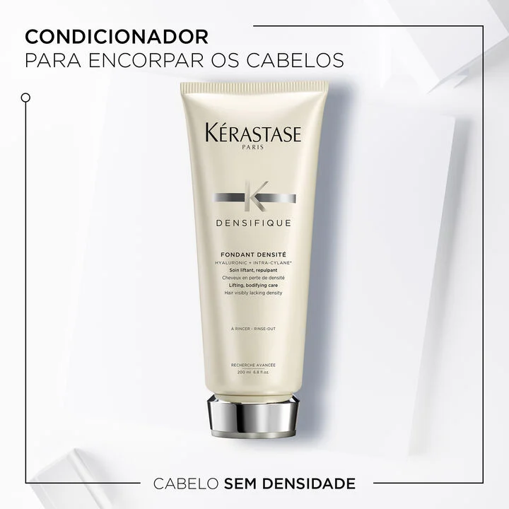 O Fondant Densité é o condicionador Kérastase para quem sofre com afinamento capilar. O Condicionador Densifique foi desenvolvido para tratar os cabelos finos e ralos a partir do interior da fibra capilar. Este condicionador para cabelos finos e ralos é usado para fortalecer o cabelo e contém Ácido Hialurónico que oferece hidratação e resiliência para dar volume ao fio, enquanto os Minerais Intra-Cylane® proporcionam força e estrutura ao cabelo a partir do interior da fribra através de uma estrutura tridimensional, fazendo com que o cabelo fino pareça mais espesso. Este condicionador para cabelos finos é leve e sedoso, repõe a textura, a consistência e a resiliência do cabelo para um efeito encorpado imediato. Os cabelos finos e enfraquecidos são uma preocupação do passado com a ajuda de Fondant Densité, o nosso condicionador para cabelos enfraquecidos.